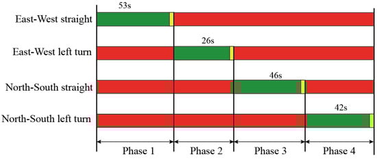 To minimize disruptions from frequent phase changes, the maximum green light time is set to 50 s, with a minimum of 10 s, and the yellow light time is set to 3 s [19,22]. The agent has two types of actions to choose from: one is to extend the current phase’s green light duration by 5 s, denoted as ; the other is to switch to the next phase after the yellow light time has elapsed.