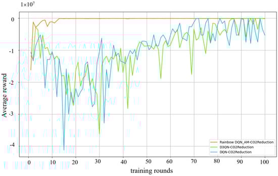 Under different traffic volume conditions, the Rainbow DQN_AM-CO2Reduction model demonstrated significant advantages in both the algorithm and reward function compared with classical DRL algorithms and reward functions. This confirmed its effectiveness in reducing the average vehicle waiting time and average CO2 emissions at signalized intersections under mixed traffic conditions.