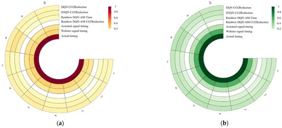 As shown in Table 10, the average vehicle CO2 emissions increase overall with rising traffic flow. Consistent with the trend in vehicle waiting time, the Rainbow DQN_AM-CO2Reduction scheme achieves the best optimization results for average vehicle CO2 emissions across all three traffic intensities, with values of 175.18 g, 180.53 g, and 192.02 g, respectively. In the 2400 pcu/h and 3600 pcu/h scenarios, the proposed scheme reduces CO2 emissions by 1.73% and 1.41%, respectively, compared with the next best scheme, D3QN_CO2Reduction. In the 4800 pcu/h scenario, emissions are reduced by 6.26% compared with the next best scheme, Rainbow DQN_AM-Time. In medium and low traffic intensity scenarios, the optimization performance of the D3QN-CO2Reduction and DQN-CO2Reduction models, which are based on the same reward function, is inferior to that of the Rainbow DQN_AM-CO2Reduction scheme. As traffic intensity increases, the performance gap in model optimization widens further. Under high traffic intensity, the proposed model reduces average CO2 emissions by 9.42% and 13.16% compared with D3QN-CO2Reduction and actuated signal timing schemes, respectively.