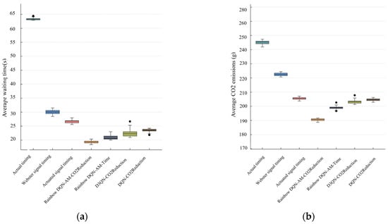 As depicted in Table 9, the average vehicle waiting time increases with traffic flow, with the actuated signal timing scheme experiencing the greatest rise and the Rainbow DQN_AM-based scheme showing the least. The Rainbow DQN_AM-CO2Reduction scheme achieves the optimal optimization effect under all three traffic intensities, with waiting times of 4.38 s, 6.88 s, and 11.46 s, respectively. At traffic volumes of 2400 pcu/h and 3600 pcu/h, the D3QN-CO2Reduction scheme performs better than the Rainbow DQN_AM-Time scheme, with waiting times of 4.85 s and 7.45 s, respectively. At the highest traffic intensity, the optimization effectiveness of the timing schemes using the DQN and D3QN algorithms significantly declines, while the scheme based on the Rainbow DQN_AM algorithm demonstrates better robustness. Furthermore, the proposed scheme in this paper demonstrates the best optimization performance under high traffic intensity, reducing average waiting times by 18.08%, 45.66%, and 68.09% compared with the Rainbow DQN_AM-Time, DQN-CO2Reduction, and Webster signal timing schemes, respectively.