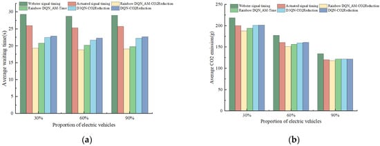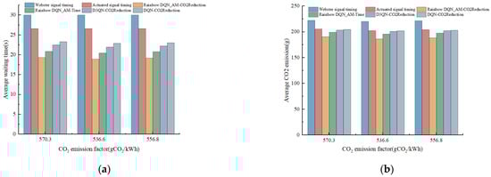 (2) The model’s effectiveness is validated through a comparative analysis with DQN, D3QN, Webster signal timing, and actuated signal timing methods, using real-world traffic data from an actual intersection. Finally, the model’s applicability is tested under various scenarios, including different proportions of electric vehicles, varying electric vehicle carbon emission factors, different traffic volumes, and the consideration of autonomous vehicle penetration rates.