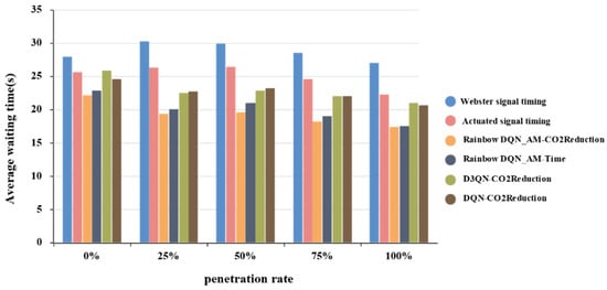 To accurately illustrate the performance differences of signal control schemes under varying penetration rates, Figure 12 shows that traditional signal control schemes, such as Webster and actuated signal control, perform less effectively in terms of average vehicle waiting time optimization in mixed traffic environments compared with non-mixed traffic environments. This is because, in mixed traffic conditions, especially under low penetration rates, connected autonomous vehicles cannot form an effective collaborative driving environment. In contrast, the proposed scheme in this study demonstrates more stable control strategies in mixed traffic environments. As the penetration rate increases, the average vehicle waiting time decreases. Specifically, at a 50% penetration rate, the average waiting time is 19.63 s, which is 6.35% lower compared with the scheme with the same algorithm but a different reward function, 14.20% lower compared with the scheme with the same reward function but a different algorithm, and 25.78% lower compared with the actuated signal control scheme.