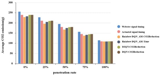 Figure 13 shows the trend of average vehicle CO2 emissions under different penetration rates. Similar to Figure 12, the proposed optimization scheme performs best at a 50% penetration rate, where the average vehicle CO2 emissions are 167 g. Compared to the Rainbow DQN_AM-Time scheme, D3QN-CO2Reduction, and the actuated signal timing scheme, emissions are reduced by 4.58%, 6.60%, and 6.97%, respectively. This is because, in a mixed-traffic environment, connected autonomous vehicles require frequent acceleration and deceleration, and other control schemes fail to learn the correct strategies effectively. It is noteworthy that at a 100% penetration rate, the CO2 emissions component in the reward function is smaller, and thus, the performance difference between the proposed scheme and the Rainbow DQN_AM-Time scheme is not significant.