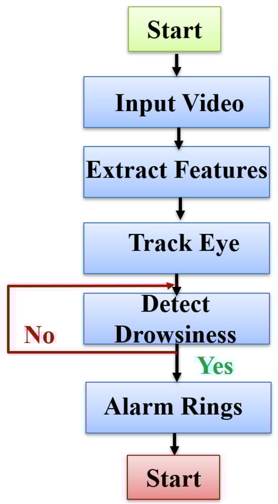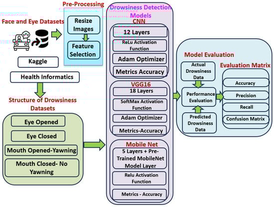 The aim of this work was to evaluate the effectiveness of various deep learning algorithms that incorporate facial expressions, physiological indicators, and driver behavior analysis in a driver drowsiness detection system. The research focused on creating and assessing this system using deep learning techniques, utilizing two datasets, the Kaggle Yawn Eye dataset, which includes RGB images, and a subset of the Health Informatics dataset, containing grayscale images, to test model generalizability. The methodology involved pre-processing the images through resizing and labeling and employing Haar cascade classifiers to identify key features such as the eyes and mouth. Three deep learning models—a CNN, VGG16, and MobileNet—were selected for their effectiveness in image tasks and were trained using the Kaggle dataset with a 70:30 training–validation split. Their performance was evaluated using metrics such as accuracy, precision, recall, and the F1-score to ensure reliability. Additionally, the models were tested using the Health Informatics dataset to assess their adaptability to new data, while computational efficiency and training times were analyzed for potential real-time applications. To achieve this objective, the following approach was considered, as shown in Figure 3: