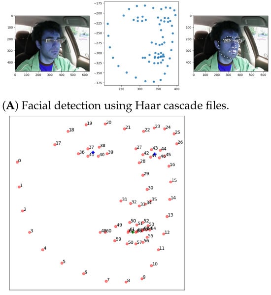 To perform this, Haar cascade classifiers were applied for object detection, evaluating the intensity distribution of picture pixels. The “extract face landmarks” tool was used to illustrate the identification of the mouth and eye regions, obtaining 68 landmark points matching to distinct facial features. These points, given as (x, y) coordinates, assisted in identify certain facial regions. Figure 6A depicts the face extraction process on an input image, demonstrating the facial and mouth region landmarks discovered by the usage of the “extract landmarks” function. The centroid of the Region of Interest (ROI), which included the eyes and mouth, was also selected to underline critical detecting aspects. Figure 6B displays the centroid of the ROI covering the mouth and left eye. By focusing on these specific traits, the impact of extraneous information on the training dataset was minimized, boosting the classification models’ performance. Overall, the feature extraction stage assisted the training of the classification models for the precise detection of yawning and eye states, boosting efficacy and precision through the use of Haar cascades and face landmark extraction.