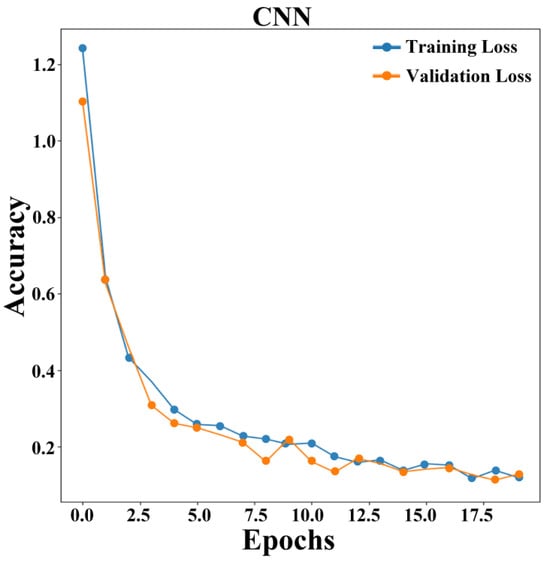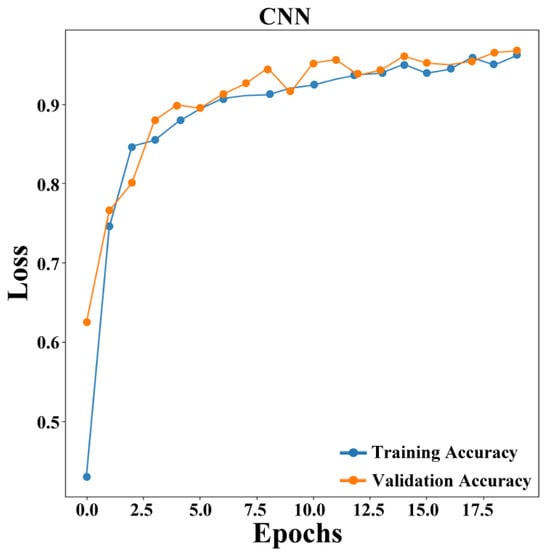 The CNN model underwent training using the training and validation datasets for a total of 20 epochs. Categorical cross-entropy was implemented as the loss function, while the Adam optimizer was deployed. The results of the 20 epochs of training and validation showed a steady improvement in performance over the epochs, with an increasing accuracy and a decreasing loss. The CNN model achieved an accuracy of 95.80% for training and 96% with the validation set. Figure 8 shows the plot of loss vs. epochs for the validation and training dataset for the CNN model. Figure 9 shows the plot of accuracy vs. epochs for the validation and training dataset for the CNN model.