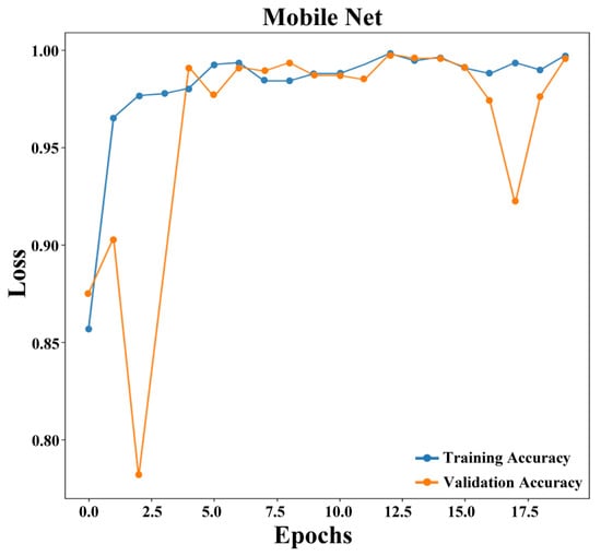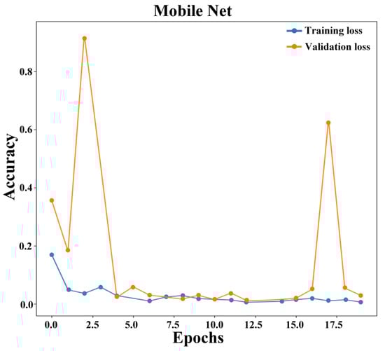 The global average pooling layer minimized the spatial dimensions of the feature maps and summarized them into a single vector for classification. The output of the pooling layer was then sent via two fully connected dense layers with 1024 and 512 units, respectively, before being routed through the last classification layer that had 4 units. Figure 14 illustrates the plot of loss versus epochs for the validation and training dataset of the MobileNet architecture. Figure 15 illustrates the plot of accuracy versus epochs for the validation and training dataset of the MobileNet architecture.