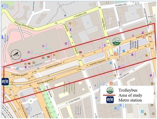The selection of the study area focuses on the Barón node and Avenida Argentina, Valparaíso, Chile, where trolleybuses and metro services are accessed and used (see Figure 2). This area represents a central and highly significant point within the city of Valparaíso, with a high influx of public transport users, ensuring the relevance and representativeness of the results obtained. Additionally, the Barón node stands out as a strategic connection point between the trolleybus system and the EFE metro, making it a key location to assess pedestrian access between both systems. By focusing on this area, it will be possible to thoroughly analyze the factors influencing the quality of pedestrian access, such as infrastructure, safety, and comfort, for both trolleybus and metro users. Furthermore, evaluating pedestrian access in the direction of the trolleybuses and metro in the selected sector of Valparaíso’s plan is considered important, as this will help identify potential deficiencies or areas for improvement in the public spaces designated for pedestrians. This information will be valuable for enhancing the user experience and promoting greater integration and accessibility in the city’s public transportation system.