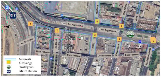 To carry out the evaluation of pedestrian access between the transportation modes under study, all the routes within the previously described area are identified. These routes correspond to each block that connects both modes of transport. The evaluation is conducted in both directions: from the trolleybuses to the EFE trains and vice versa, covering both pedestrian axes of the block (both sidewalks).