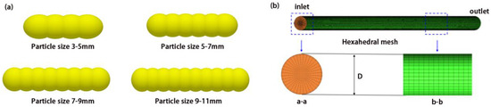 Modeling of solid feed and pipeline. (a) Four different particle sizes of solid feed; (b) Pipeline hexahedral meshing.