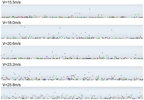 After stable transportation, the motion state and distribution of solid feed are observed, as well as the distribution state of solid feed in the pipe within the sampling section (4.5–5.5 m from the entrance of the pipeline) under different transportation wind speeds, as shown in Figure 2. Different colors represent different particle size ranges of solid feed. Solid feed according to particle size from small to large is colored in black, red, green and blue. The simulation results show that, under the same conditions, with the increase in the conveying wind speed, the speed difference between the upper and lower end of the particles at the bottom of the pipeline increases, and the particles will be subjected to upward force according to the Bernoulli principle. At the same time, the particle rotation causes the Magnus effect lift caused by the superposition of the circulation around the particles and the air flow, and the amount of accumulated feed at the bottom of the pipeline decreases, the suspension amount increases and the flow pattern of the particle group transitions from sedimentation to suspension flow.