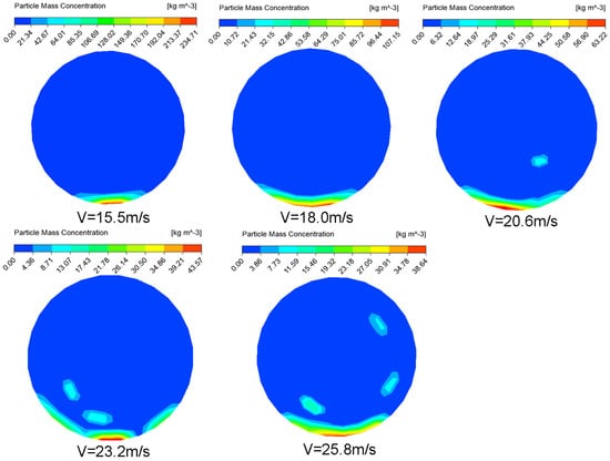 In order to investigate the distribution state of solid feed along the pipeline direction in pneumatic conveying, the pipeline section 5 m away from the feeding port was taken as the sampling section. The simulation results are as follows: Figure 3 is the cloud map of the mass distribution of solid particles at different wind speeds, the solid particles are mainly concentrated at the bottom of the pipeline, other conditions remain unchanged and, with the increase in the conveying wind speed, the particles at the bottom of the pipeline gradually spread out from the accumulation state to both sides. When the conveying wind speed increased to 20.6 m/s, “suspended” particles began to appear, and the number of “suspended” particles increased with the increase in the wind speed, indicating that the transportation efficiency of solid particles in the conveying pipeline was gradually improved. In addition, the maximum concentrations of particle mass distribution were 234.71, 107.15, 63.22, 43.57 and 38.64 kg/m3. This shows that the greater the conveying wind speed, the more dispersed the solid particles in the pipeline, and the friction and collision between the particles are reduced and the transportation efficiency is improved.