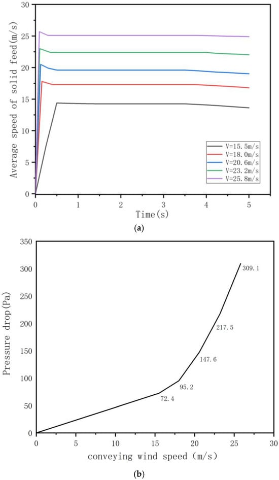 In the dynamic balance stage, the speed of conveying materials has a great impact on the working time and efficiency of the entire system, and the pressure drop as the power source of conveying not only to ensures the continuous and stable movement of solid feed but also overcomes the various resistance generated by collision and friction during the conveying process. Therefore, in this section, the average speed and pressure drop of particle groups under different conveying wind speeds in the conveying pipeline are studied. Figure 4a shows the relationship between the average speed of solid feed and time at different conveying wind speeds. When conveying tends to be stable, the average speed of solid feed is 13.8 m/s, 17.4 m/s, 18.9 m/s, 21.8 m/s and 24.9 m/s. It can be seen from the figure that, at the beginning of transportation, the average speed of solid feed increases linearly and rapidly to the maximum, then decreases and tends to be stable. It was also observed that the higher the conveying wind speed, the faster the average solid feed speed increased at the beginning of conveying.