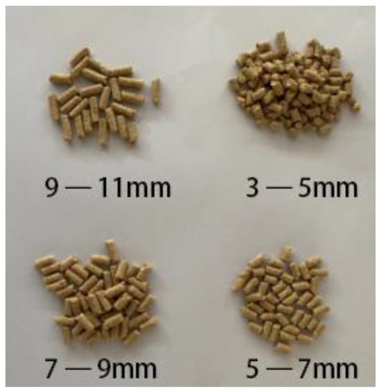 In this paper, compressed air is used as the conveying gas, and solid feed is used as the conveying medium, as shown in Figure 6. The feed divided into four groups according to particle size, which are 3–5 mm, 5–7 mm, 7–9 mm and 9–11 mm, respectively. Table 2 shows the relevant parameters of the solid feed used in the experiment.