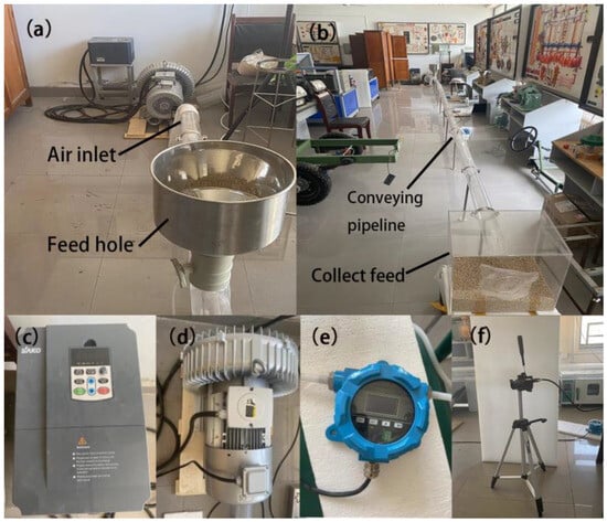 Pneumatic conveying device diagram. (a,b) Pneumatic conveying device test bench; (c) Sanke frequency converter; (d) High-pressure fan; (e) CHWVN-WD4100YA28 model sensor; (f) HTSUA1333GC-T high-speed camera.