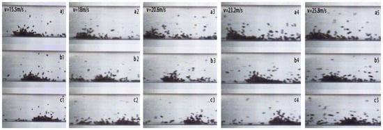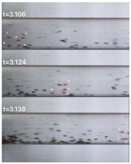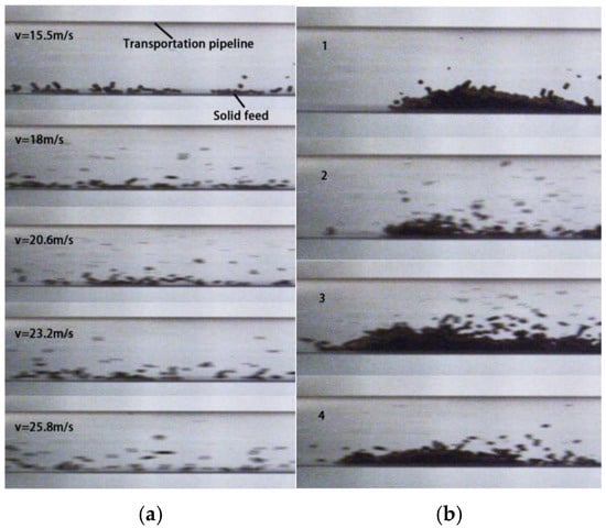 In order to calculate the speed of suspended particles, a high-speed camera is used to shoot the motion state of the solid feed in the sampling pipe section, so as to calculate the speed here. As shown in Figure 10, the length of the sampling pipeline captured by the high-speed camera is 0.3 m, and its FPS parameter is set to 12 frames per second. In any time period, five suspended particles are randomly selected to measure their movement time and distance, and their numbers are 1–5. The speed of the five particles is calculated and the average value is taken, as shown in Table 5. The average speed is 8.34 m/s. According to the above method, ten different time periods were selected in the transport process, and the average value was calculated. The solid feed speed corresponding to the five transport wind speeds was divided into 8.57 m/s, 10.29 m/s, 12.28 m/s, 14.66 m/s and 17.36 m/s. According to the data, the particle velocities were 55.3%, 57.1%, 59.6%, 63.2% and 67.3% of the conveying wind speed, respectively. With the increase in conveying wind speed, the solid feed velocity in a suspension state increased, and its increment gradually increased.