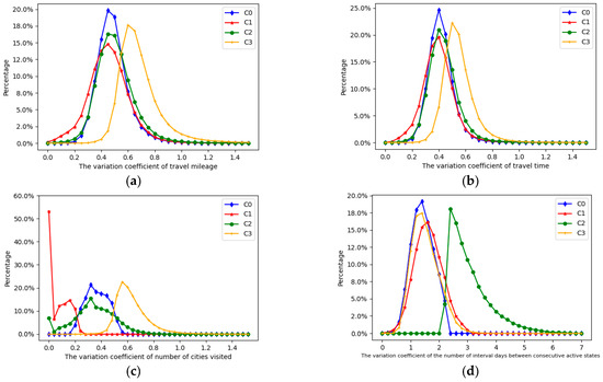 We identified the stability patterns of trucks using FCM clustering based on four indicators: the coefficient of variation of operating mileage, coefficient of variation of operating hours, coefficient of variation of the number of cities visited, and coefficient of variation of the number of days between consecutive active states. Based on the results shown in Figure 1, the optimal number of clusters is determined to be 4. Therefore, trucks are categorized into four classes, labeled C0, C1, C2, and C3, each representing a distinct stability pattern. Table 2 details the class cluster centroids, revealing the stability relationships from highest to lowest as follows: C1 > C0 > C2 > C3. As shown in Figure 2, the four truck types exhibit diverse stability patterns. Figure 2c indicates that C1 truckers demonstrate the highest stability in daily operating intensity and activity range, especially in the transport range, with more than 53% visiting the same number of cities daily (coefficient of variation = 0). C2 and C0, which are more than 50%, are both concentrated around 0.3. Figure 2a,b illustrate that C0, C1, and C2 exhibit similar stability in terms of daily operational intensity; more than 50% of truck drivers’ mileage coefficients of variation are clustered in the [0.4,0.6] range and more than 75% of hours of operation coefficients of variation are clustered in the [0.3,0.5] range. However, as shown in Figure 2d, the continuous operation of C2 is notably unstable, with a CV of approximately 3.2 for consecutive operating days. C0 truckers exhibit minimal stability in their daily operating intensity and activity range, possibly by transporting specific valuable cargo without temporal or spatial constraints. Interestingly, the continuous running stability of such truckers is relatively good. The cluster mass values indicate that the stability of continuous truck operation is significantly lower than the stability of the daily operating intensity and activity range. This implies that the daily mileage and driving hours of truck drivers fluctuate less than the days between continuous activities.