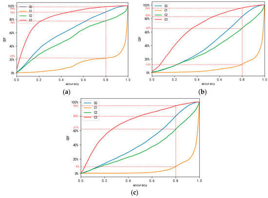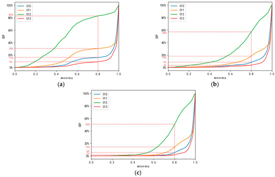 Cumulative prediction accuracy distribution of the different travel patterns. (a) Cumulative dis-tribution of KNN prediction; (b) Cumulative distribution of BP Neural accuracy; (c) Cumulative distribution of LSTM prediction accuracy.