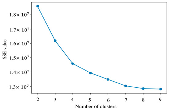 A single truck may exhibit specific operating patterns over a multi-day period, and to retrieve these hidden and repeated patterns efficiently, the FCM clustering algorithm is used. FCM is a typical divisional clustering algorithm proposed by Bezdek [24], and is mainly used to classify data distributed in a multi-dimensional data space into a certain number of classes. In the general process, the sample set is divided into fuzzy sets according to certain criteria, where is a pre-specified number of categories. Next, the clustering centers of each category are determined to minimize the objective function of the non-similarity index. The clustering results are displayed in the clustering center matrix K and the clustering effect graph [25,26]. The algorithm aims to minimize the weighted intra-class sum of squares shown in Equation (1). This study utilizes the sum of squared errors (SSE) as a metric to evaluate clustering performance. As the number of clusters increases, the intra-cluster data cohesion improves, leading to a continuous decrease in the SSE value. When is less than the true number of clusters, increasing significantly enhances the cohesion, resulting in a sharp decline in SSE. However, once reaches the true number of clusters, the rate of SSE reduction slows considerably and gradually stabilizes with further increases in .