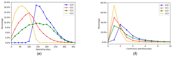 We classified the most stable trucks in terms of their operational patterns based on six indicators: turning radius, number of route cities, average operating hours, average operating mileage, operating days, and average number of consecutive operating days. According to Figure 4, the number of clusters was set to four. Consequently, the trucks were grouped into four categories, labeled as C10, C11, C12, and C13.