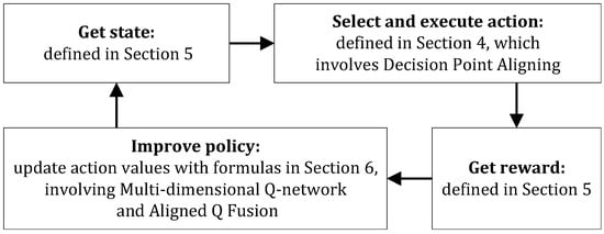 In this section, we introduce the training algorithm for MD4-AQF. It is modified from the double deep dynamic Q-network (D3ynQN) [] through four steps to better accommodate the RTSC problem within DRBPS. The first step involves recalculating the D3ynQN’s parameter n for DRBPS. The second involves generalizing D3ynQN from uni-dimensional action cases to multi-dimensional ones. The third involves fusing multi-dimensional Q values for lagging phases. The fourth involves deriving the formula for a bootstrapping-based value update in the algorithm.
