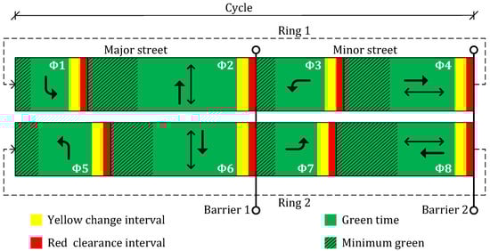 This study focuses on the most typical and complex case of DRBPS at a four-leg intersection with protected left turns and permitted right turns []. As shown in Figure 3, it uses two rings and two barriers to organize eight phases in a signal cycle. The barriers separate the phases on two streets. Between the barriers, any phase in ring 1 can be served together with any phase in ring 2. This flexibility enables phases in different rings to adjust their timing to meet imbalanced demand, making DRBPS the most commonly used structure in real-world settings.