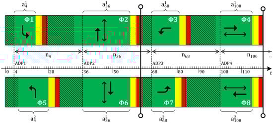 - A case of two leading phases, and . DRBPS allows an independent termination of each phase, subject to only its own minimum green. For these two phases, ADP is the moment that either phase’s minimum green expires (i.e., the “ADP1” moment in the figure). It is the last possible moment to decide whether to give this phase the time beyond its minimum green. At this point, action represents the remaining green times after the respective ends of the minimum green durations of the two phases. and can be unequal. They denote the lengths of time marked with and in the figure, respectively.
