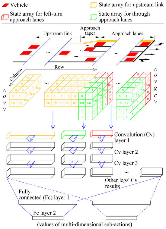 where and are the state arrays for the approach lanes on the b-th intersection leg for the left and through phases, respectively, is the state array for the lanes upstream from the approach lanes on the b-th intersection leg, and B is the number of legs at the intersection. For the test-bed signalized intersection in our experiments, the state can be represented as a high-dimensional array with elements.