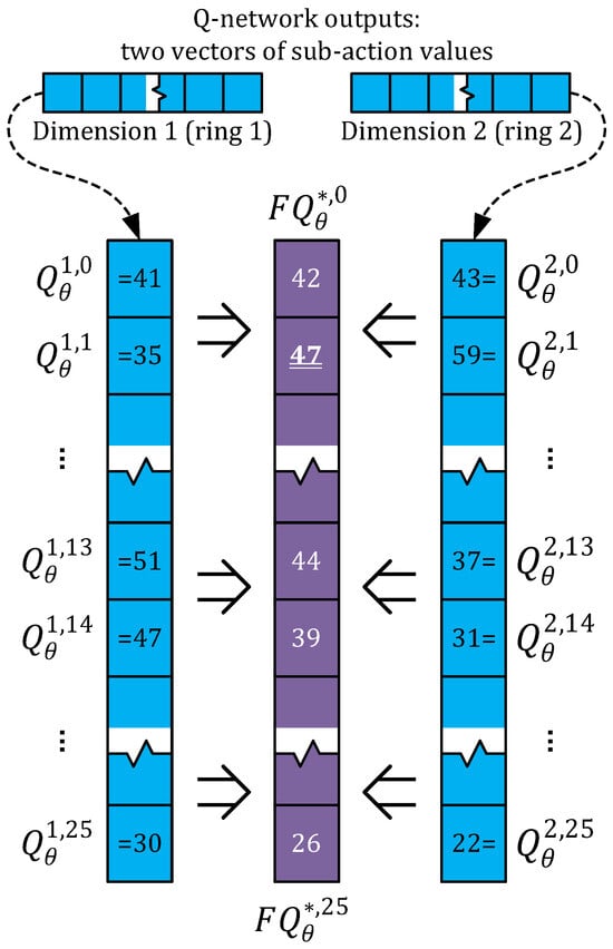 We propose “aligned Q-fusion” to address this challenge. Let denote a specific choice of sub-action for dimension d, and denote its value, where is the ordinal number of this choice in its dimension. Then, by definition is the agent’s estimate of the future rewards, conditioned on extending e seconds of green time for the current phase in the d-th ring.