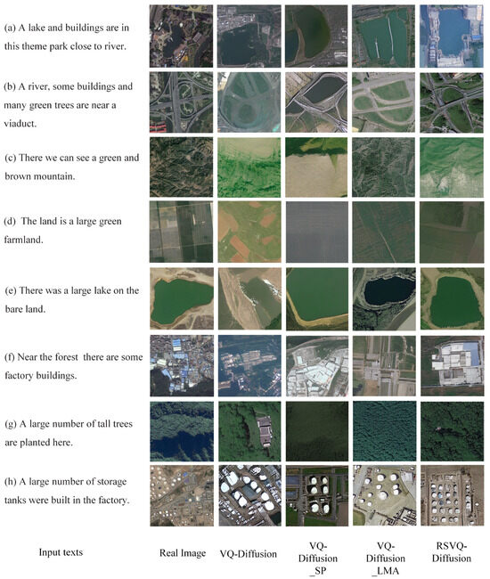 Specifically, for group (a), the text description is “This theme park has a lake and some buildings near the river”. The VQ-Diffusion model fails to capture the keyword “river”. The images generated by the VQ-Diffusion_SP and VQ-Diffusion_LMA models show enhanced spatial positioning and details. The RSVQ-Diffusion model effectively generates images that include buildings, a lake, and a river, with reasonable ground features and clear boundaries. The differences from the real images highlight their diversity. For group (b), the text keywords are “building”, “river”, “tree”, and “overpass”. The VQ-Diffusion model shows deformed overpasses, missing buildings, and blurred details. The VQ-Diffusion_SP model generates features that match the text description, but the overpass appears deformed. The VQ-Diffusion_LMA model produces a reasonably shaped overpass but lacks the semantic information of the “river”. The RSVQ-Diffusion model accurately places the overpass, with the buildings and trees reasonably structured. The river detail in the upper right corner is slightly blurred. For group (c), the VQ-Diffusion model generates distorted details; the VQ-Diffusion_SP model’s mountain textures are blurred, and the VQ-Diffusion_LMA model generates mountains with reasonable colors but with a chaotic distribution. The RSVQ-Diffusion model produces mountains with continuous textures, naturally transitioning to the brown exposed ground, with reasonable spatial structure. For group (d), the RSVQ-Diffusion model generates farmland with semi-regular geometric shapes, better color transitions, and better spatial distribution compared to the original model’s generated images. From groups (e) to (h), the images generated by the VQ-Diffusion model exhibit target deformations, twisted spatial structures, and unreasonable color distributions, failing to reflect the corresponding textual information. The VQ-Diffusion_SP and VQ-Diffusion_LMA models generate images that reflect improvements in spatial structure and local details. The RSVQ-Diffusion model produces images with complete lake structures and clear boundaries, factory buildings that align with real target scene distributions and are neatly arranged, realistic tree colors, and well-organized oil tanks in the factories. The overall image quality generated by the RSVQ-Diffusion model surpasses the other three models.