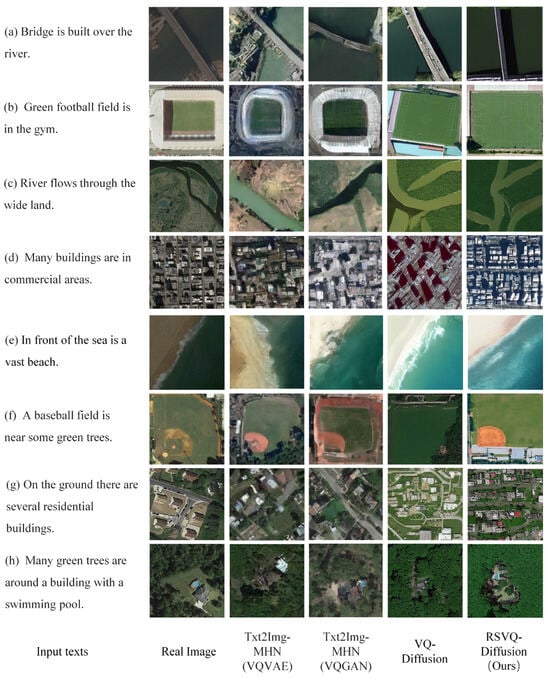 For instance, in group (a), with the text “A bridge is built over the river”, the image generated by the Txt2Img-MHN (VQVAE) model has an unclear lower left edge of the bridge, making it difficult to discern ground features, and it fails to capture the local structural features of the image. The Txt2Img-MHN (VQGAN) model’s image shows a deformed and blurred bridge with no clear distinction from the background. The VQ-Diffusion model’s image has relatively clear boundaries but shows deformation at the upper right edge of the bridge and distortion in the bridge area. The RSVQ-Diffusion model’s image, however, presents a complete bridge structure with clear boundaries and shadows beneath the bridge, enhancing realism and spatial coherence. In group (b), the Txt2Img-MHN models generate images with blurred and deformed stadium boundaries and indistinguishable details. The VQ-Diffusion model’s stadium edge has an unreasonable shape, and the surrounding buildings are deformed. The RSVQ-Diffusion model generates a clear image of the stadium with a visible central circle and clear, reasonable boundaries. In group (c), the Txt2Img-MHN models produce images with basic spatial structures but blurred details, while the VQ-Diffusion model’s left black area has an unnatural color texture distribution. The RSVQ-Diffusion model generates images with a reasonably structured river and clear details. In group (d), the Txt2Img-MHN models’ images have blurred building boundaries and overlapped ground features. The VQ-Diffusion model’s image shows deformed and distorted building boundaries, while the RSVQ-Diffusion model generates images with neatly arranged buildings and clear boundaries, displaying visually realistic images. In groups (e) to (h), other models’ images exhibit blurred details, deformed ground features, twisted boundaries, and missing target areas. The RSVQ-Diffusion model’s images show a natural texture distribution at the beach–sea boundary, orderly structured baseball fields and buildings, a consistent spatial distribution of residential areas and roads, and clear, reasonable surrounding ground features of swimming pools. These target areas are rich in detail, have realistic colors, and have different regional structures that match the distribution of real remote sensing images, clearly outperforming the other models.