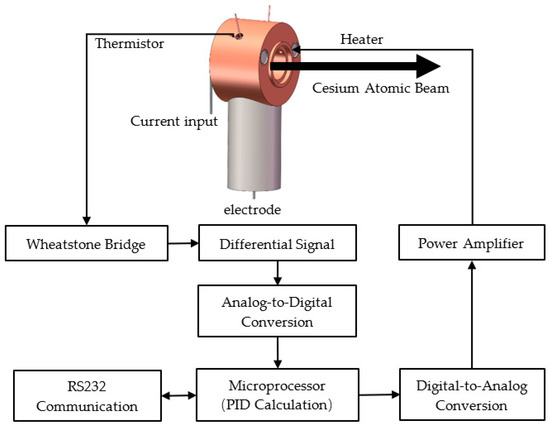 This paper is structured as follows: We present the fundamental cesium oven design in Section 2. In Section 3, the hardware design, including the sensors, the electric bridges, and the power amplification, is presented. We describe the software design in Section 4, including the digital filter, the temperature conversion, and the digital PID (proportional, integral, differential) operation. The experimental results and discussion are stated in Section 5. The conclusions are summarized in Section 6.