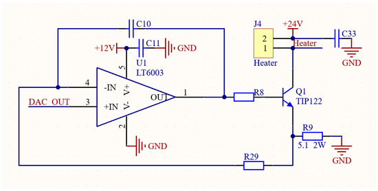 The output of the front-end digital-to-analog conversion is driven by an operational amplifier to control the heating power through the power transistor. The Darlington transistor TIP122 was chosen for its amplification factor of 1000 and a maximum output current of up to 5 A, which meets the amplification requirements. Based on the heating requirements of the cesium oven and the results of preliminary experiments, a 5.1 Ω power resistor was selected as the sampling resistor, which can control the maximum heating current to around 500 mA. This maximum heating current is the optimal value obtained after comprehensive consideration of factors such as heating speed, power supply capacity, and cooling conditions.