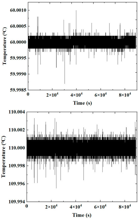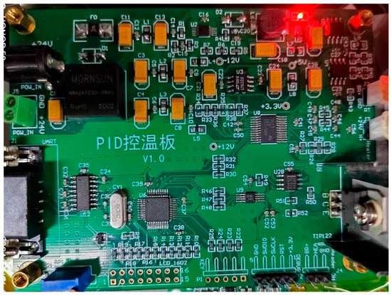 After the completion of the system’s software and hardware debugging, we tested its temperature control effect. By connecting the leads of the sealed cesium beam tube through the terminal block, the thermistor and heating element pre-installed on the cesium oven were connected to the circuit. Multiple temperature working points were set for long-term testing. The temperature control module is in Figure 6, and the results are shown in Figure 7.