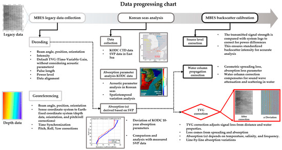 This study aims to address these limitations by utilizing site-specific Sound Velocity Profiler (SVP) and Conductivity–Temperature–Depth (CTD) data to re-evaluate legacy MBES datasets. By correcting MBES datasets that have not adequately considered water column parameters, this study evaluates how underwater absorption affects MBES backscatter data. By re-calculating the absorption loss using water column information and integrating site-specific parameters such as temperature, salinity, and depth, the study seeks to mitigate discrepancies in the backscatter results. This approach enhances the representativeness of legacy MBES datasets in explaining the physical variability of the marine environment, thus improving their applicability for secondary analysis in scientific research and industrial applications. Furthermore, it highlights the importance of collecting water column information during MBES measurements, especially in dynamic environments such as the Korean seas [5,6,7,26,27].