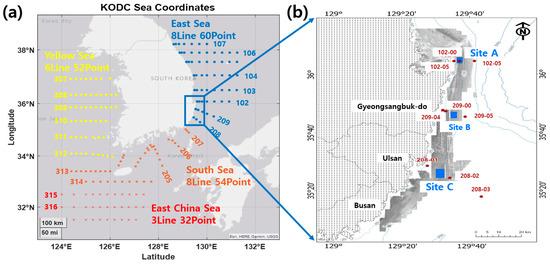 (a) Map of all survey lines and points in Korean territorial waters where CTD data were collected by KODC (KODC oceanographic survey map); and (b) three specific sites off the East Sea coast used for MBES measurements (Sites A, B, and C).