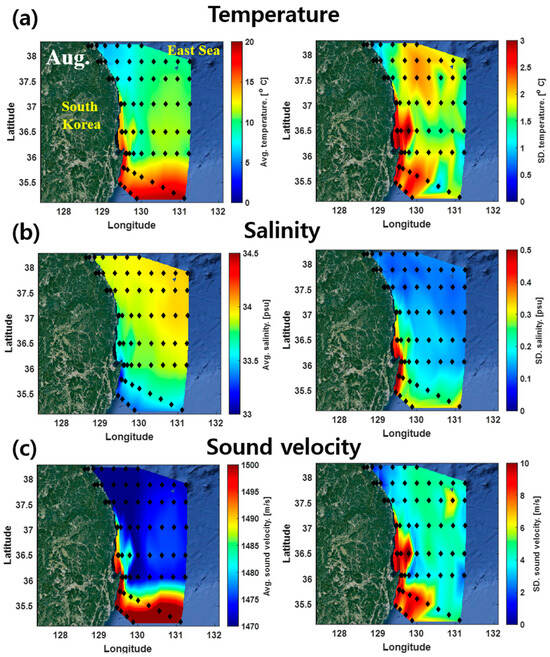Distributions of depth- and time-averaged (a) temperature, (b) salinity, and (c) sound velocity and corresponding standard deviations in the East Sea of Korea for August from 2000 to 2021.