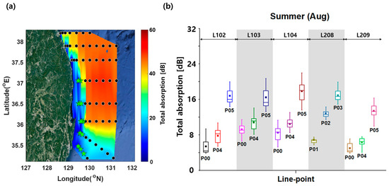 To clearly identify the overall trend of sound absorption across different water layers in the East Sea, we calculated the total sound absorption. Total absorption in the East Sea was determined by integrating the absorption coefficient with respect to depth and adding it to the maximum depth, in order to account for the total absorption with respect to bidirectional propagation through the entire water column. The formula for total absorption (2) for a bidirectional path is