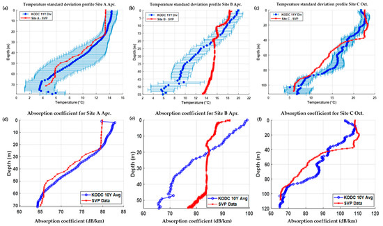 (a) Comparison of the 11-year mean and standard deviation of temperature at KODC 102-04 point (Site A) with SVP-derived water temperature in April. (b) Comparison of the 11-year mean and standard deviation of temperature at KODC 209-04 point (Site B) with SVP-derived water temperature in April. (c) Comparison of the 11-year mean and standard deviation of temperature at KODC 208-02 point (Site C) with SVP-derived water temperature in October. (d) Comparison of the absorption coefficients at Site A in April between the 11-year average KODC data and SVP data. (e) Comparison of the absorption coefficients at Site B in April between the 11-year average KODC data and SVP data. (f) Comparison of the absorption coefficients at Site C in October between the 11-year average KODC data and SVP data. The frequency was 300 kHz.