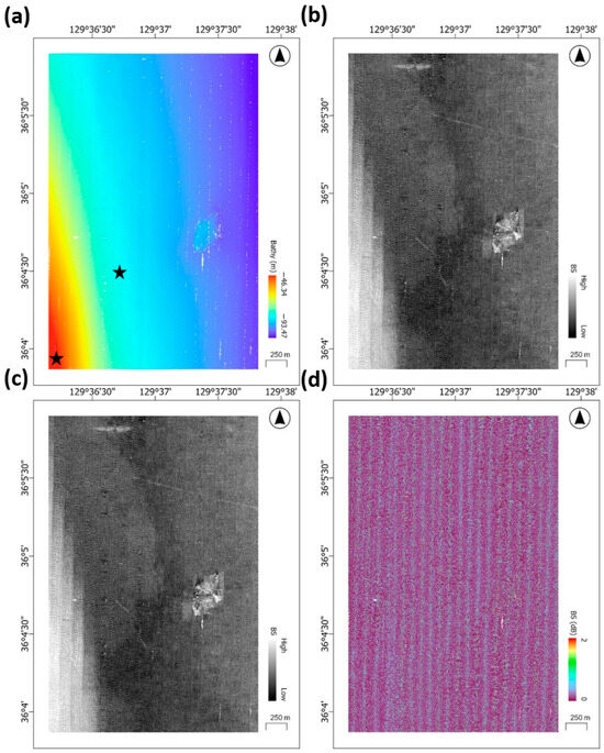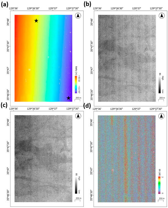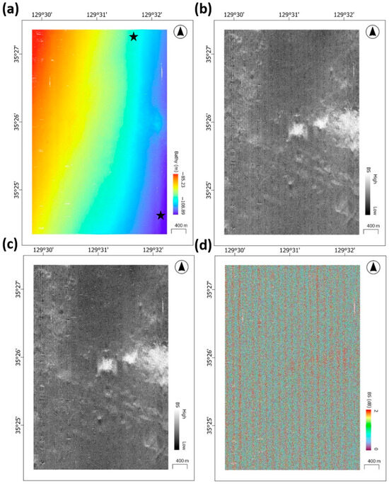 The Korean seas present unique challenges for MBES data processing, due to their highly variable seasonal and regional environmental characteristics. Influenced by major currents such as the Kuroshio and Liman currents, these waters exhibit significant changes in temperature and salinity across different regions and seasons [18,19,20,21,22]. For example, localized shifts in salinity and temperature caused by these currents directly impact the speed of sound and absorption loss in seawater, resulting in variability in backscatter intensity. Despite these challenges, limited research has addressed the integration of site-specific water column parameters into MBES backscatter data processing approaches, particularly considering Korean waters [19,20,23,24].