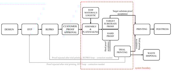 The first (i) step of proof preparation and packaging of the raw materials, such as ink, printing base, and photopolymer plate, for printing is considered. The second step (ii) includes all the logistic management of raw materials, including transportation to the printing company and storage before usage.