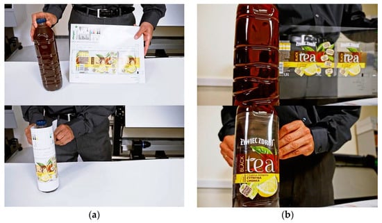 This study conducted a comparative analysis of the process of proofing on a target substrate to standard hard proofing. Proofing is an integral part of the printing process. The proof simulates the final product’s visual characteristics, allowing us to see the typesetting, color separation, artwork, etc. Images of the proof samples used to represent a standard proof and a proof on a target substrate are shown in Figure 2. Standard hard proofing (Figure 2a) is performed on a white paper base, which does not allow for a complete assessment of the appearance of the final print, especially when the final printing product makes use of colored substrate (not white) or transparent films (Figure 2b). Despite a customer’s acceptance of the proof, the final product may differ from the design. It may be necessary to stop production and change the design. In this case, the printing house is exposed to the costs of disposing of failed prints, and redesigning, re-proofing, and resuming printing.