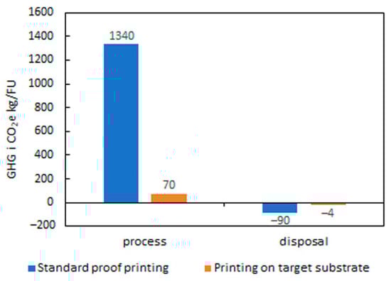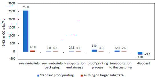 Our results confirm that the innovative process of proofing on target substrates, developed at Chespa, has a lower environmental impact than the standard proofing process. The total GHG emissions are 2610 and 132 kg of CO2e/FU for the conventional hard proof method and the Chespa method of proofing on the target substrate, respectively. At the same time, this process is characterized by lower raw material consumption compared to the conventional system. The standard proofing process requires plastic raw materials that constitute 800 kg of PE, contributing to 2.337 kg of CO2e climate emissions. In comparison, the system of proofing on the target substrate has a PE demand of 0.017 kg, and a 0.050 kg of CO2e climate emission. Furthermore, the process of proofing on a target substrate is related to lower water demand and electricity consumption (400 kg/FU) than the standard proof printing process (29,490 kg/FU). The proofing development on the target substrate reduces the waste production by 45 times compared to the standard proofing process. It should be noted that, despite the similar impact contribution for both processes, the raw material, energy usage, and water demand are much lower for the target substrate-proofing process. Finally, the target substrate proofing process exhibits less toxicity influence on terrestrial, marine, and freshwater aquatic due to requiring less raw materials, having a lower energy demand, and requiring less disposal [].