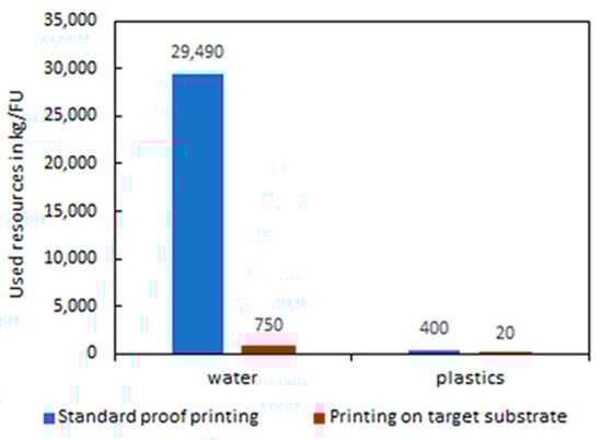 This study considered raw materials and water demand apart from the GHG calculation. For the raw material consumption, the usage of plastics was examined because the proof printing was performed on PE film. Additionally, the water uptake was considered. Figure 5 shows the water and plastic consumption in both processes. Trial printing requires more water and material than proofing. This is consistent with the use of the trial printing process to obtain a final proof print. The water demand is nearly 40 times higher for standard proofing than for target substrate. It decreases from 29,490 to 750 kg per FU for standard hard proofing and target substrate proofing, respectively. This is related to the demand for water to produce raw materials and wash the printing machine. According to the calculations conducted herein, the plastic demand is 40 times lower for the process of proofing on a target substrate. It decreases from 400 to 20 kg per FU for standard and target substrate proofing, respectively. The lower level of raw material consumption is related to lower GHG emissions. The GHG emissions decrease from 2.337 kg of CO2e to 0.050 kg of CO2e for standard proof printing and proofing on target substrates, respectively. This was expected because the hard proof printing process might require trial printing with an overprint of up to 5000 LM of substrate. On the other hand, while the process of proof printing on a target substrate might also require trial printing, the calculation included a trial printing process on average every 20 test attempts.
