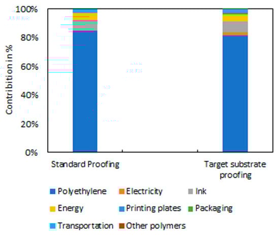 Polyethylene material is the most important contributor to the proofing process. Its contribution ranges from 82% to 85% for both the target substrate and standard proofing processes. Another element is ink preparation processes (marked as “ink” in Figure 6), ranging from 7 to 8% for the target substrate and standard proofing, respectively. This is related to the need to conduct a trial printing process in industrial conditions.