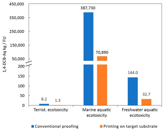 Moreover, due to the significant share of chemical compounds (ink additives, resins, plasticizers, improvers of the rheological properties of inks, pigment solvents), including cleaning agents for printing tools and plastics, involved in the production process, a reduction in the negative impact on the aquatic environment can be observed for the target substrate proofing system. The system of proofing on a target substrate generates a five-fold lower negative impact on the marine environment than the traditional method. Moreover, the environmental impact on inland waters of target substrate proofing is over four times lower and equals 32.7 kg of 1,4-DCB-Aq/FU. In comparison, the freshwater aquatic ecotoxicity for conventional proofing equals 144.0 kg of 1,4-DCB-Aq/FU.
