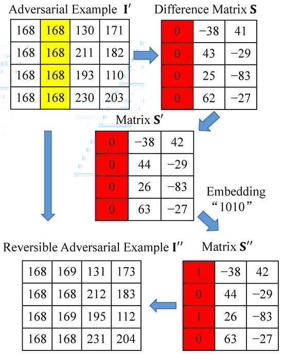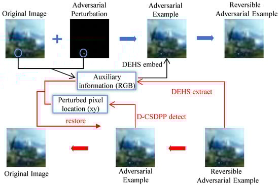 However, although the adversarial perturbations generated by these classic adversarial attack methods are typically minor, the degradation of image data remains an unavoidable reality. Even minor perturbations can result in failures in specific computer vision tasks, particularly in critical areas such as medical imaging, military applications, and digital forensics [,]. Data hiding technologies embed the secrets into a cover [], while reversible data hiding (RDH) enables the exact restoration of the original image with the aid of the embedded auxiliary information. Reversible adversarial example (RAE) generation integrates AE generation with RDH technologies [], inheriting the functions of AE generation while enabling the exact restoration of the original images.