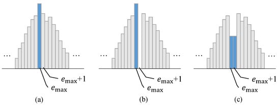 The histograms of are generated. Figure 4 shows a histogram. The highest bar in the histogram represents the most frequent difference value (usually 0), and is denoted as , as shown in Figure 4a. The bars at the right of the highest bar are shifted to the right by one unit, as shown in Figure 4b. The binary information can be embedded into the empty space, as shown in Figure 4c.