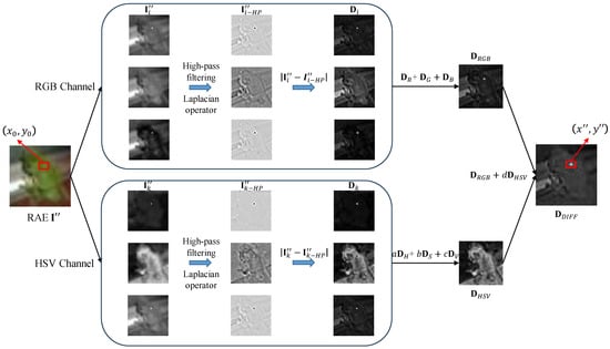 where represents the AE image, and represents the pixel value at coordinates in the image. The image size is . The three difference matrices in the three channels are where , respectively. The differential computation process is illustrated in Figure 3.