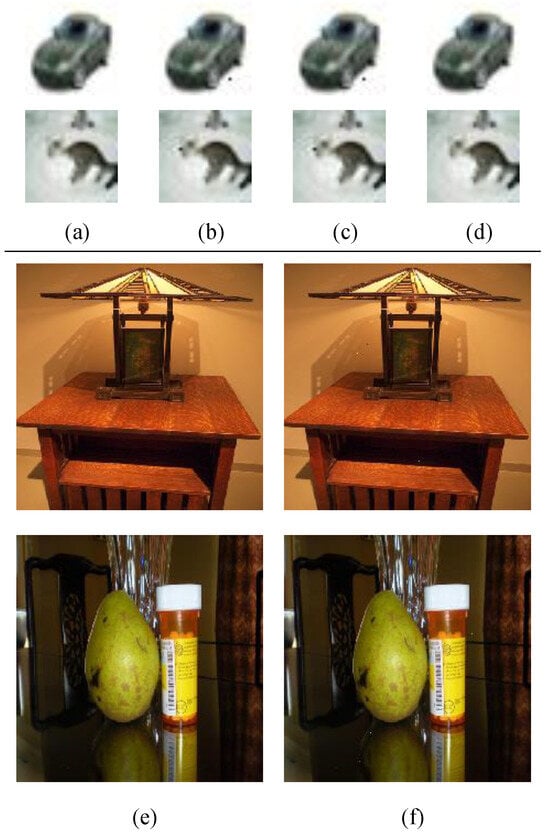 Visual results of proposed method. (a–d) based on CIFAR-10. (a) Original image. (b) AE. (c) RAE. (d) Restored image; (e,f) based on ImageNet. (e) Original image. (f) RAE.
